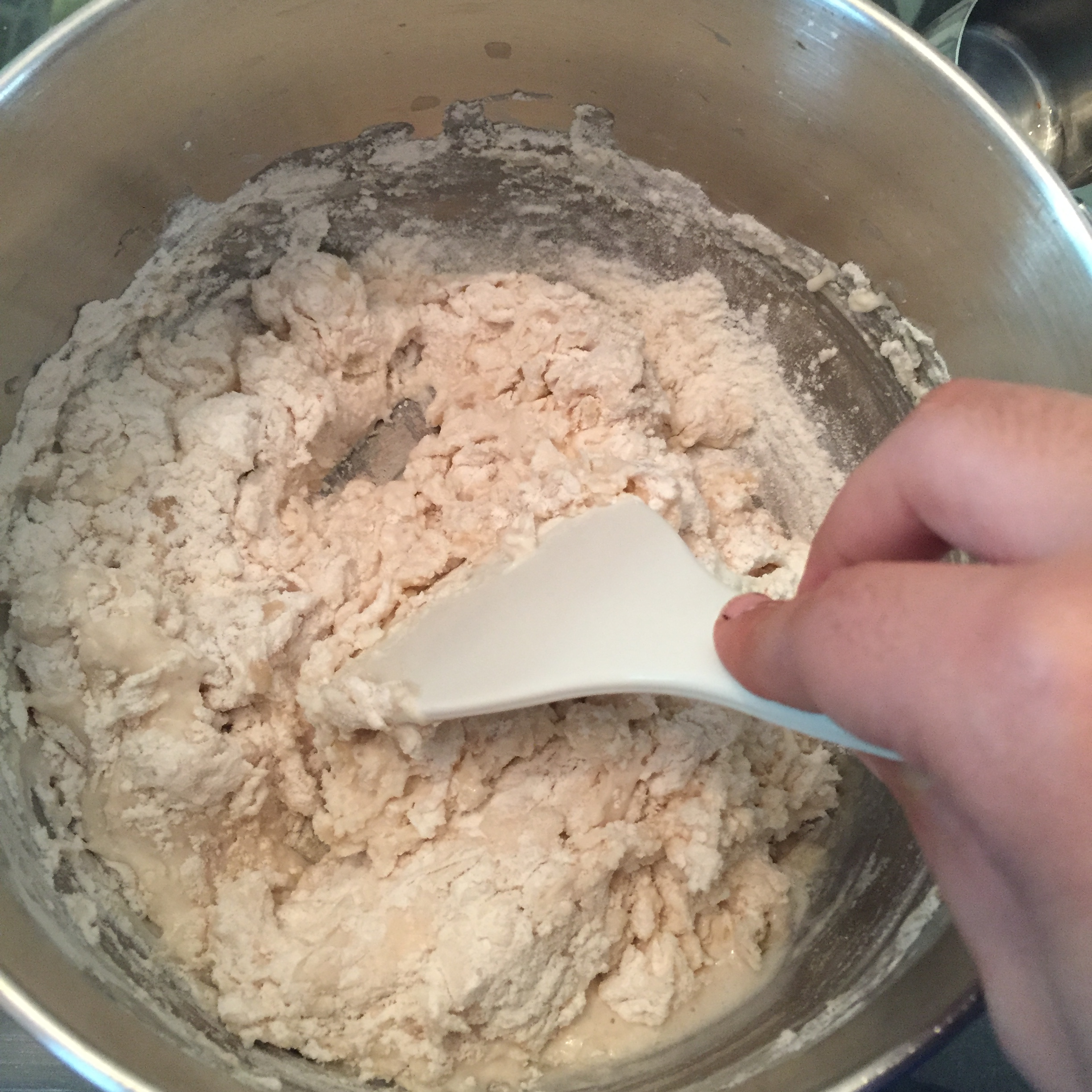 - Whisk together dry ingredients (flour, salt, baking powder) and then add in wet ingredients (water and oil)
