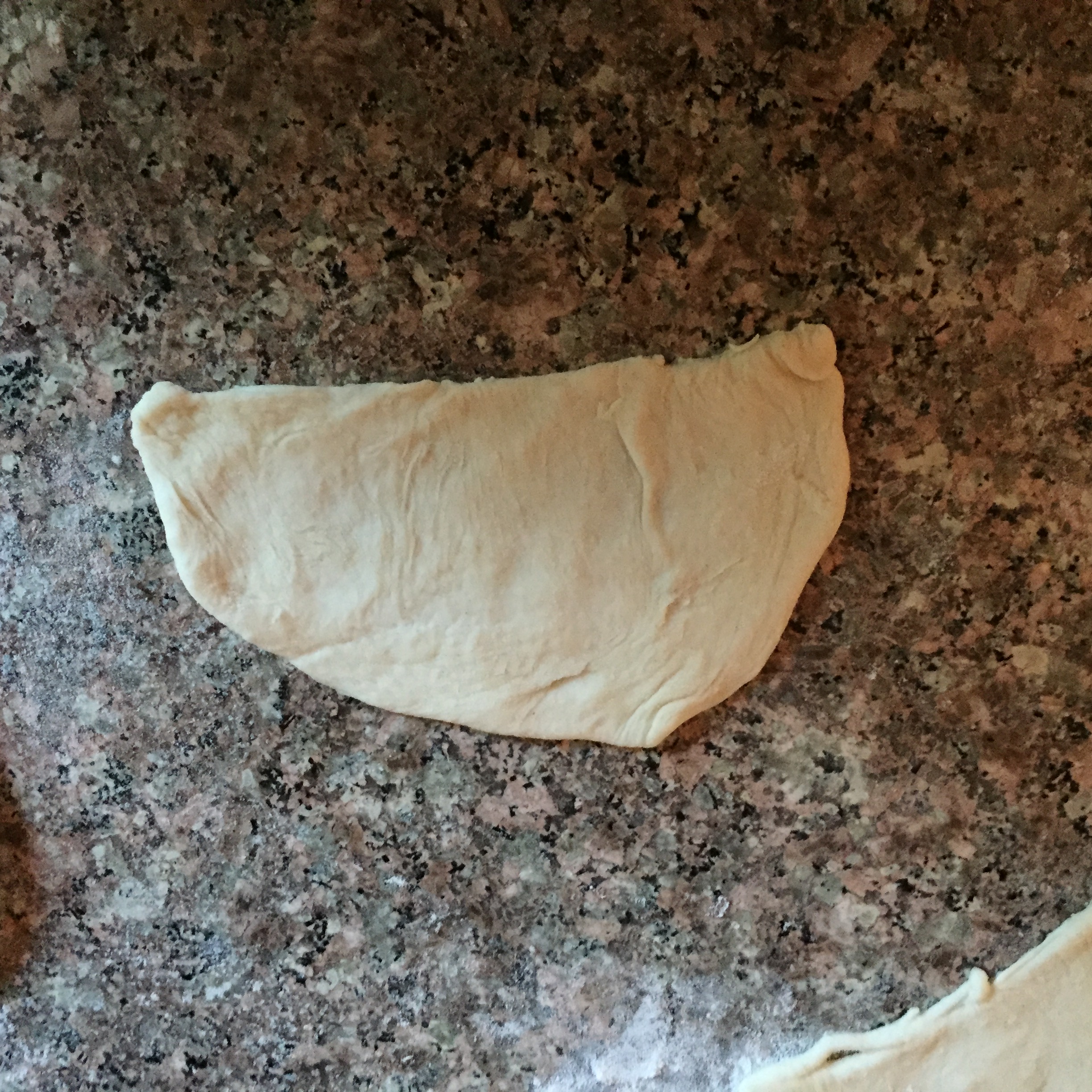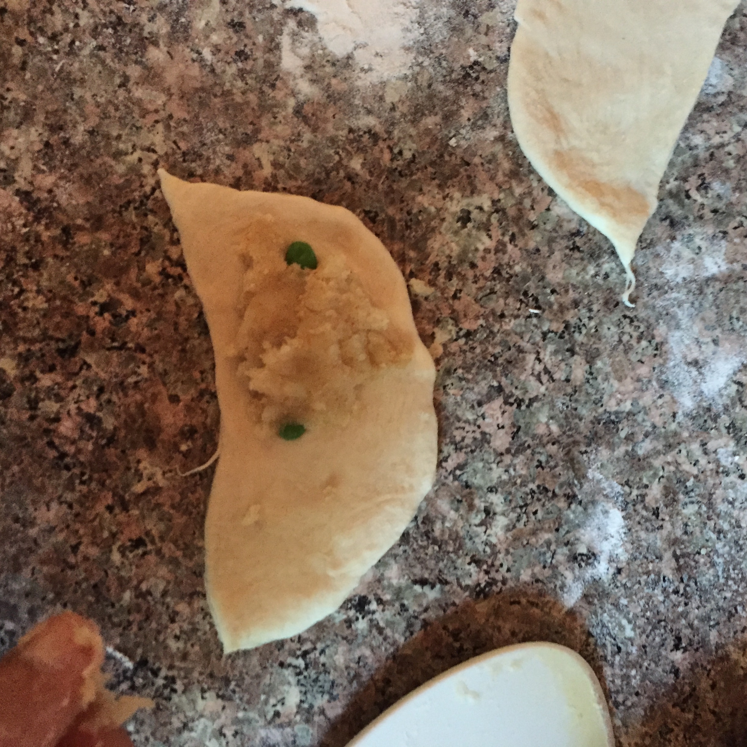 Next, just let that dough sit in a covered bowl for 30 minutes. After letting it rest, plop it onto a floured surface, again, and then cut it half. (DISCLAIMER: this recipe makes a lot of samosas (32 to be exact) so you might want to just put the other half aside for another day. I suggest storing it in an airtight container in the fridge-it should last a couple days.) Working with half the dough at a time is much easier, in my humble opinion. So, set the other half aside and direct your attention to the one at hand. Taking that half, cut in half again (now you have 2 pieces), then cut each in half again (that’s 4 pieces), then cut each of those in half (oooh what is it?!-it’s 8!!). Math is just too exciting. So yes now you can work with each piece. Take one of the dough pieces and, I reiterate, on a floured surface you want to first roll it into a ball between your palms, then roll it out into a fairly thin circle and cut that circle in half (if you haven’t figured it out yet, this means there will be 16 pieces-so amazing, I know). Now then, I am not ashamed to admit…I folded my samosas like, well, a person who doesn’t know how to fold samosas. But it’s okay!! (because I found a much better picture online on how you should do it…so, you can just ignore mine 😁). This is what I did, which, I mean, isn’t like the worst thing ever (it could just be better):