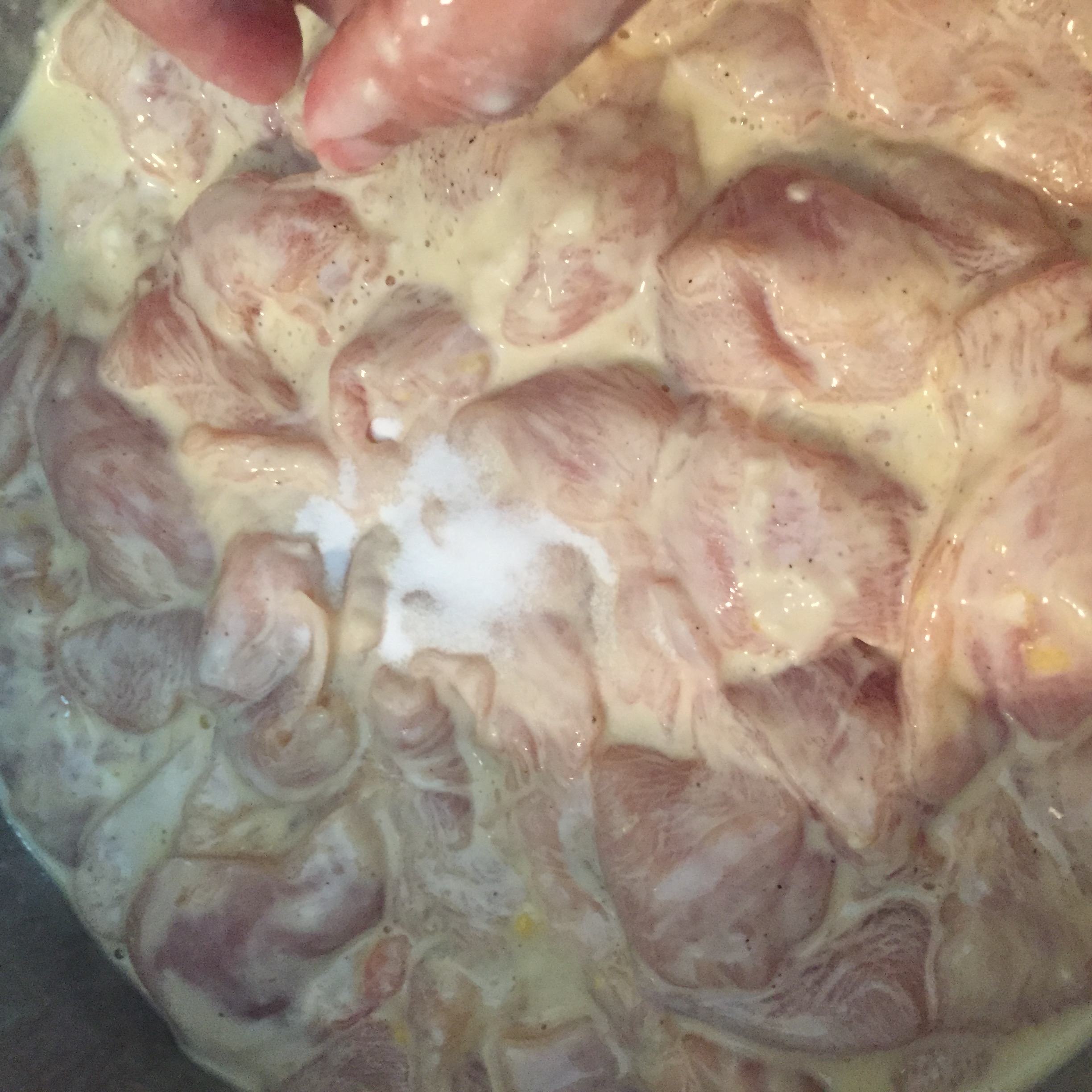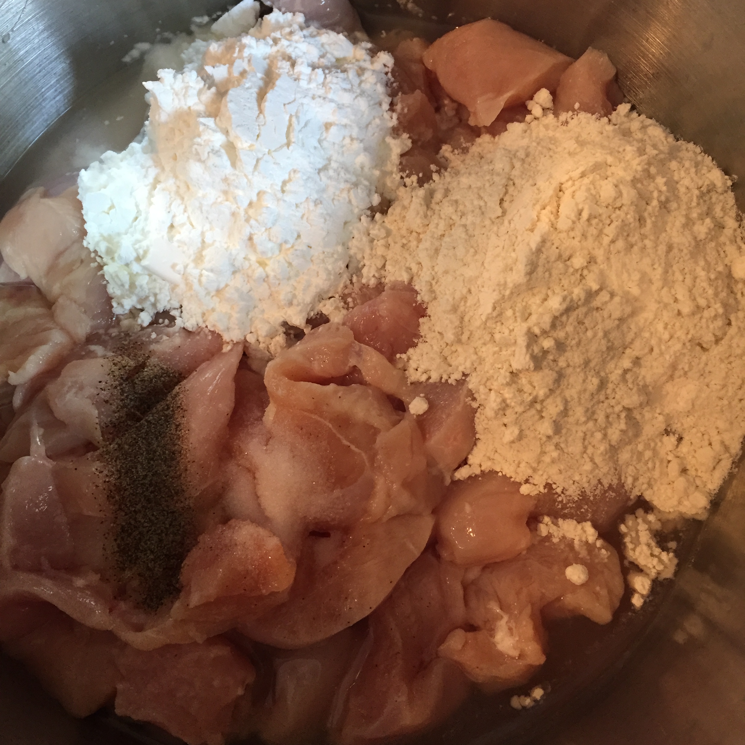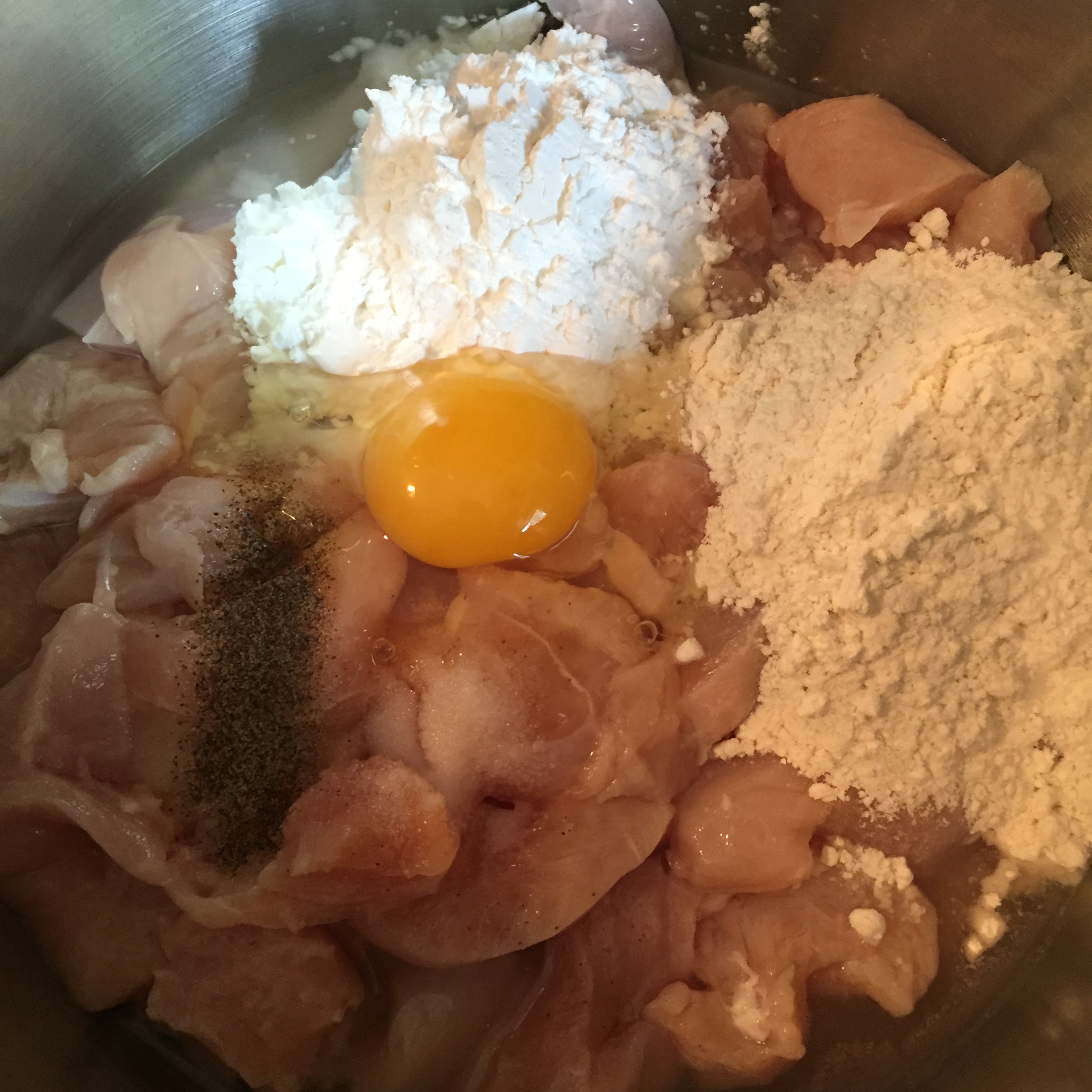 - Add in all the “fried chicken” ingredients. Thoroughly mix ingredients with chicken until evenly coated.