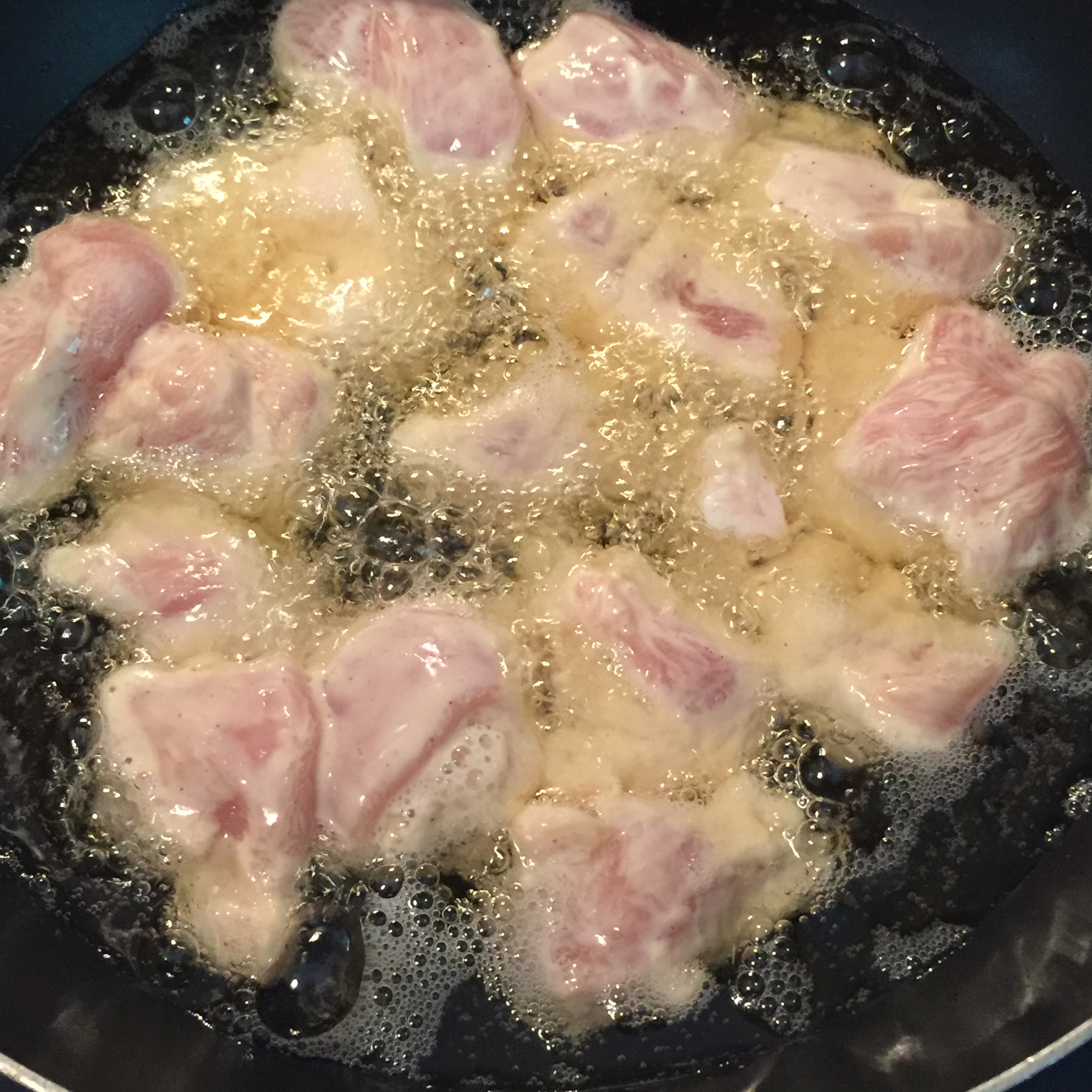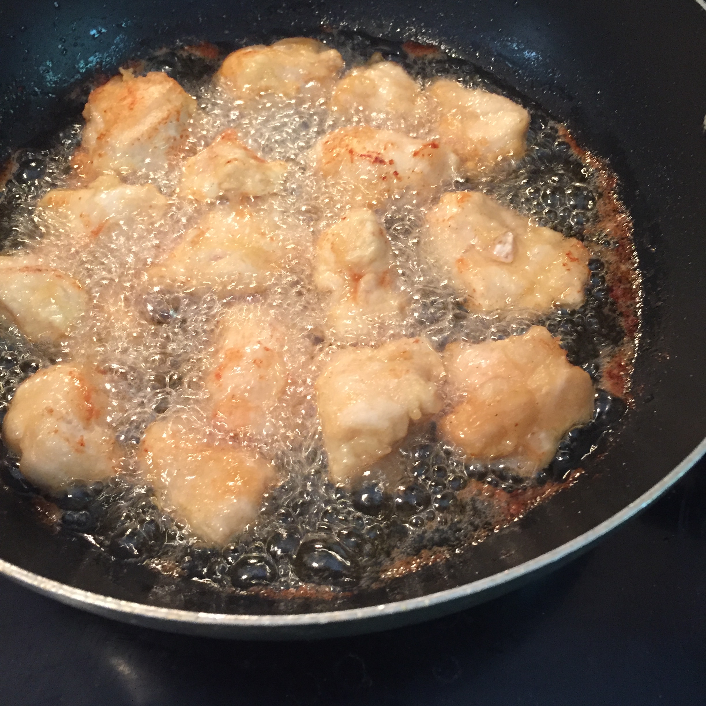 Is SHINee still serenading you as you make this chicken. They are? Oh, good. You doing this right:) You will now heat the oil on medium-high heat and to see if it has reached the desired temperature simply put in a small piece of battered chicken and if it starts to bubble around it it’s ready. Well, isn’t that just so exciting. So just put in as much chicken as you can fit.