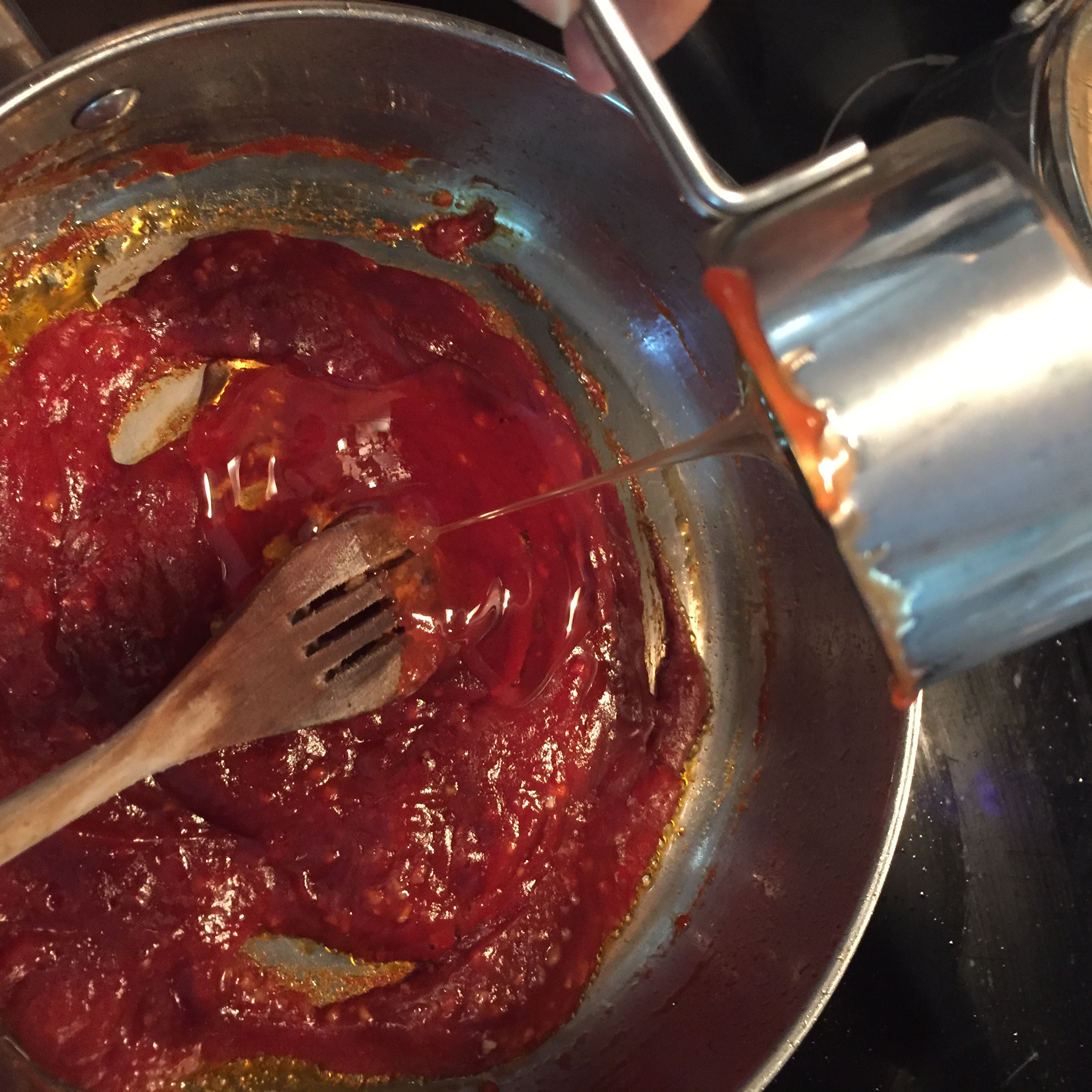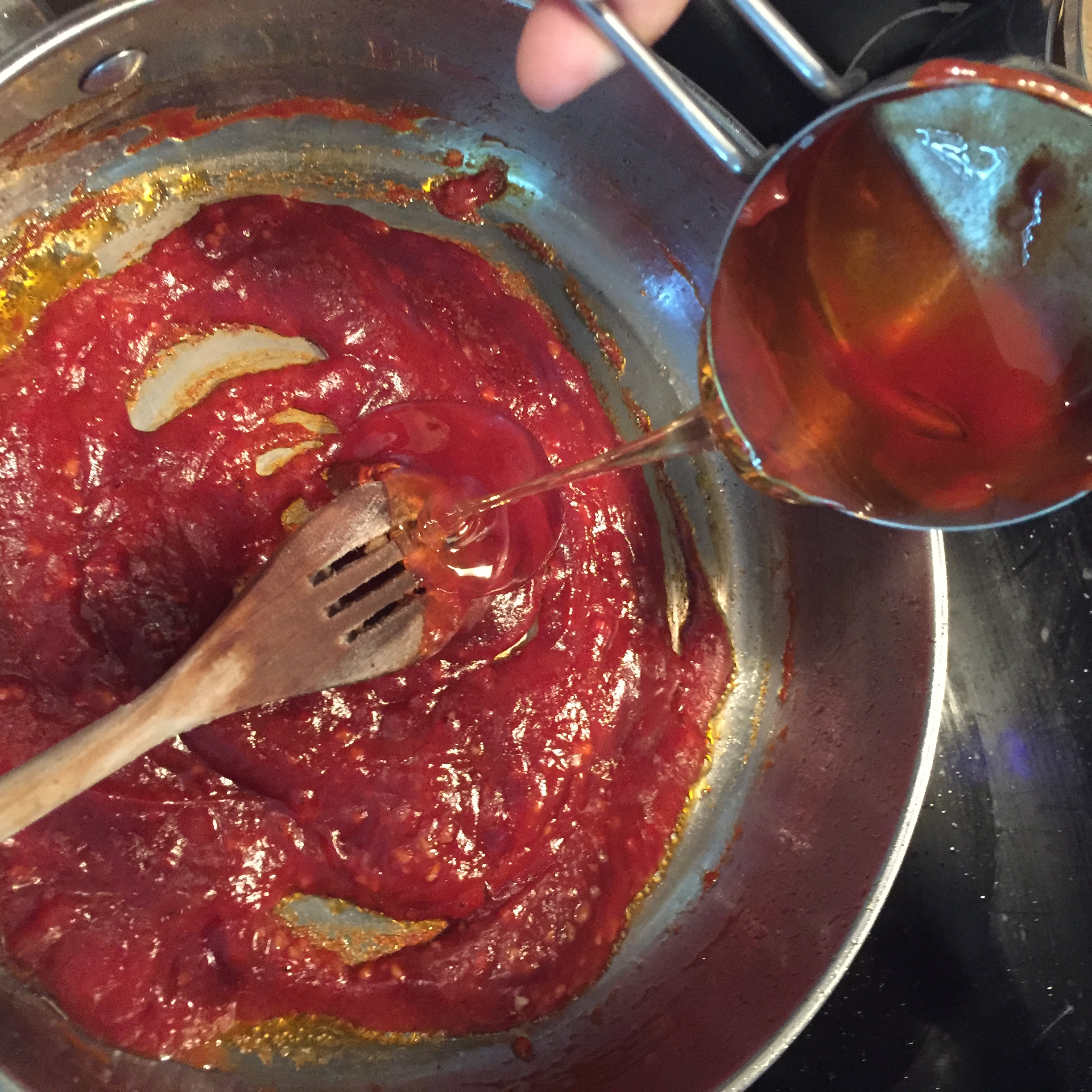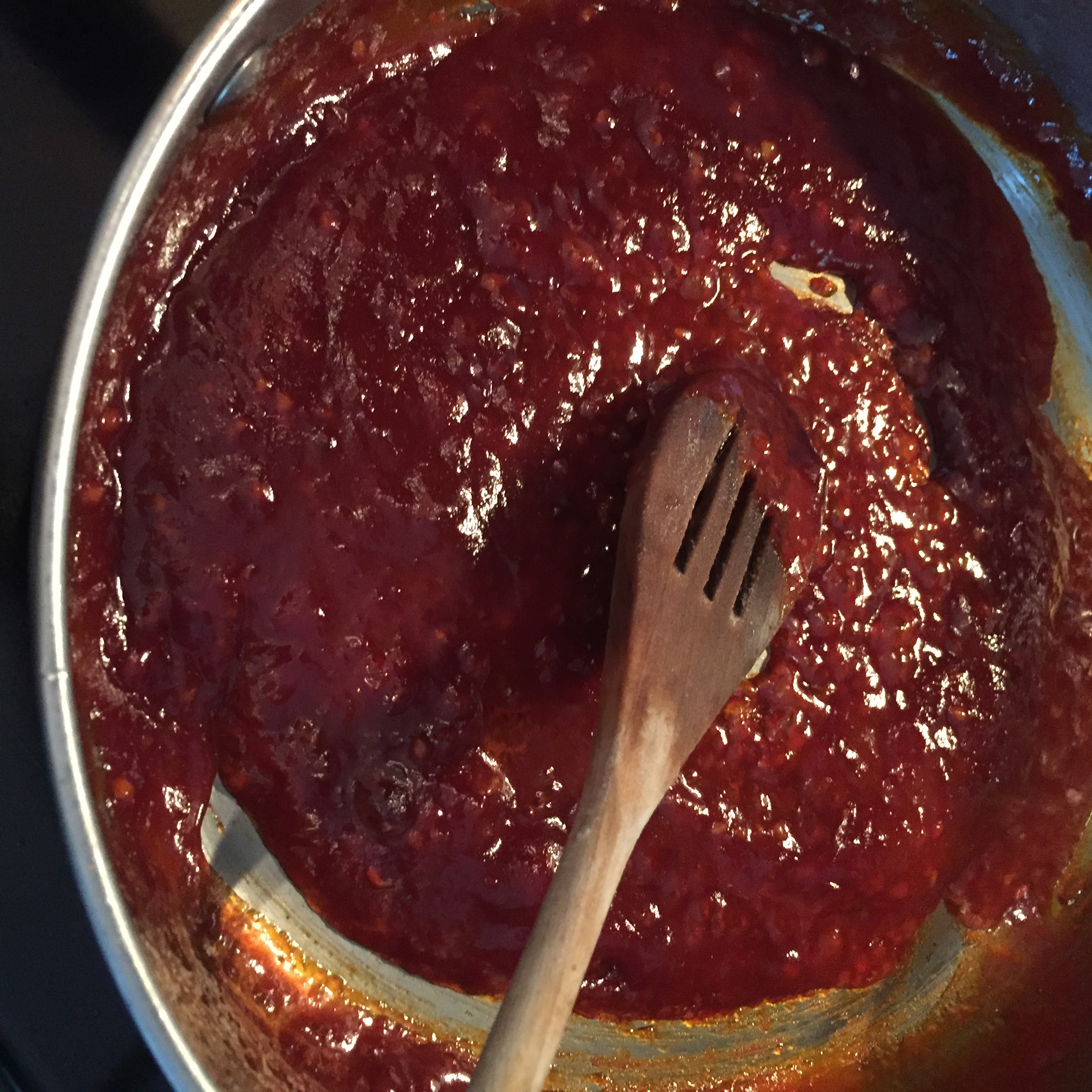 I know, this looks like it’s good enough to eat now, however, I’m about to make it even better with the delicious sauce. So, the sauce is fairly simple. In a saucepan you want to heat up the minced garlic in a tablespoon of vegetable oil on medium heat and once it starts to brown you can add in all the other ingredients of ketchup, honey, gochujang, and vinegar. The gochujang/hot pepper paste is the most important part of this recipe so don’t try to substitute it out with something else like I did for some other ingredients. It’s not an ingredient that has a flavor you can easily replicate with something else. So, if you want to try this recipe out I really encourage you to go out and buy gochujang if it’s not something you usually have. It can be found at, most likely, any Korean section of your local Asian market. Also, don’t worry if you have some left over it can be used in tons of other recipes. Anywho, once all the sauce ingredients are well combined you can turn the heat off and toss in all that nicely fried chicken that you made (good job🤗) and coat it in all that sauce-y goodness.